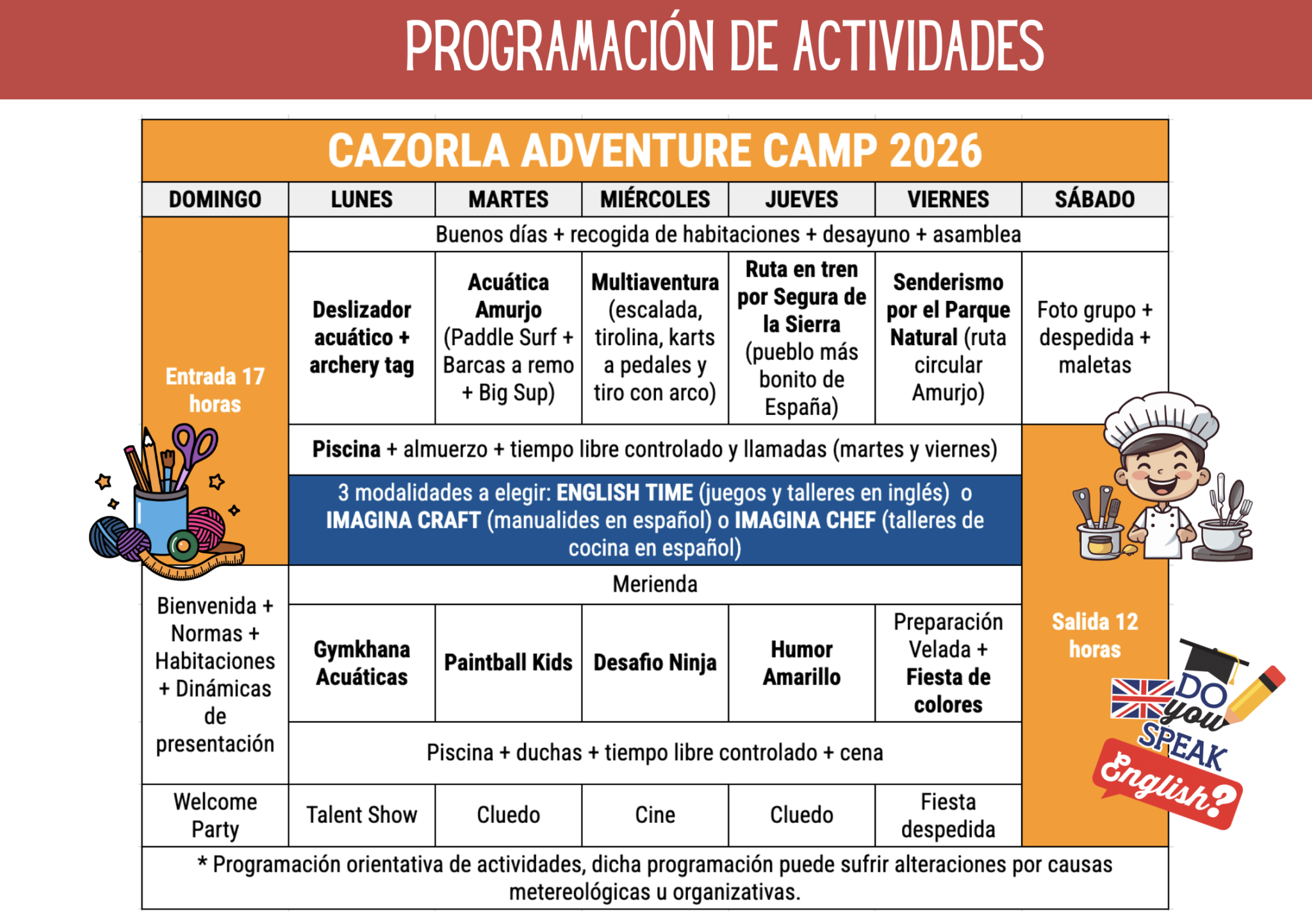 Novedad 2026: por la tarde, puedes escoger entre English Time, Imagina Crafts & Games e Imagina Chef.
